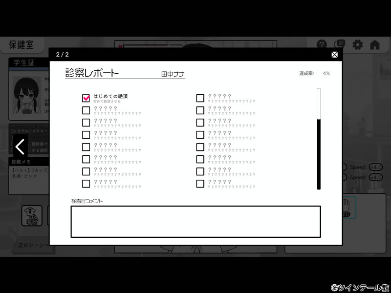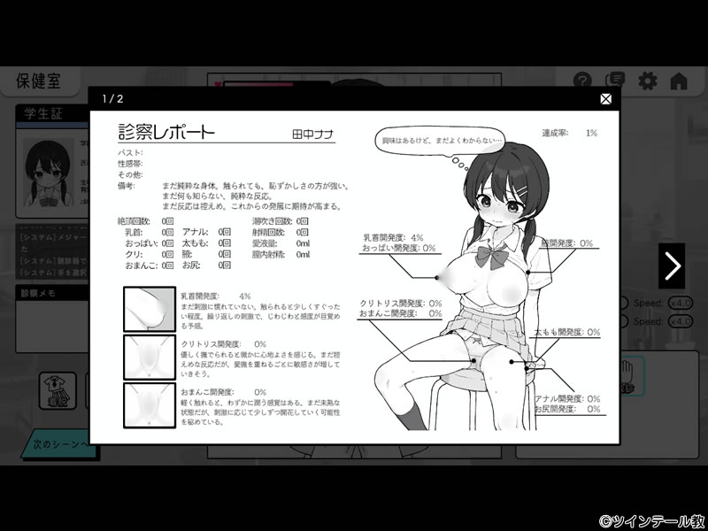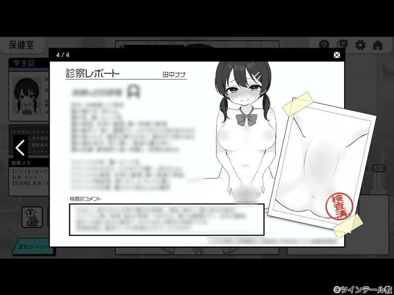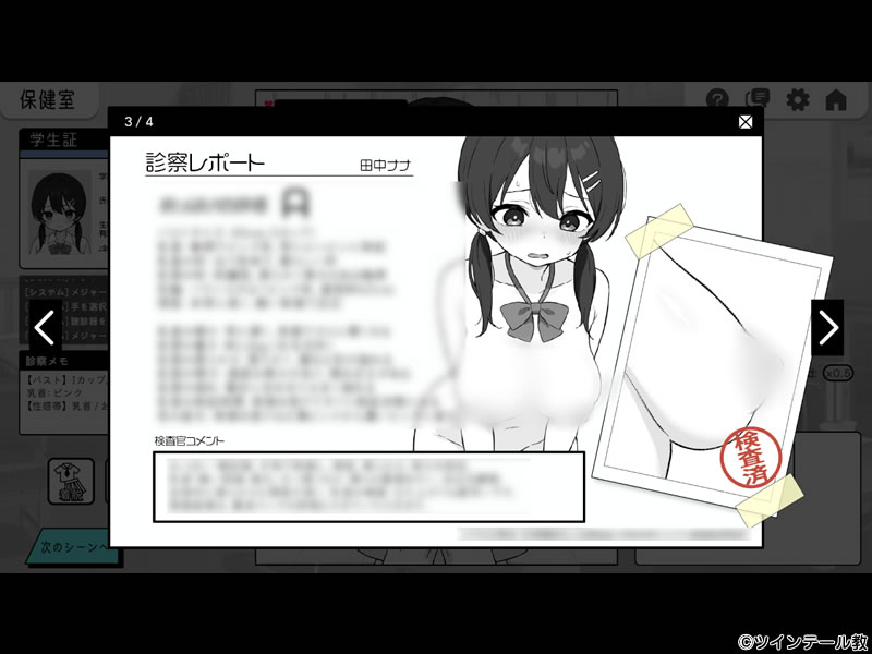 クリア後には、診察結果として「乳首・胸部・クリトリス・膣内の反応」を医学的(!?)にまとめた専用レポートを閲覧することができ、彼女の反応をあらためて振り返ることができます。