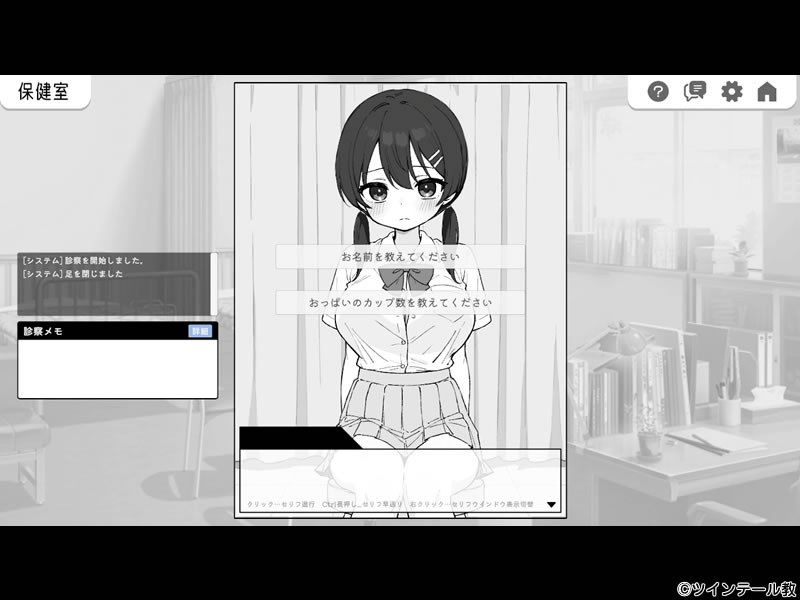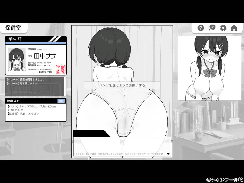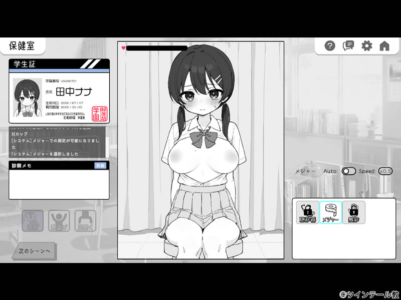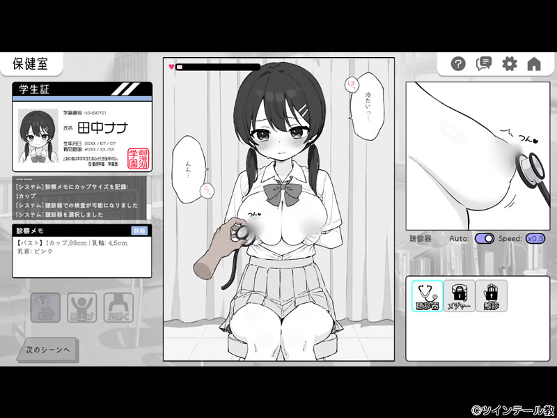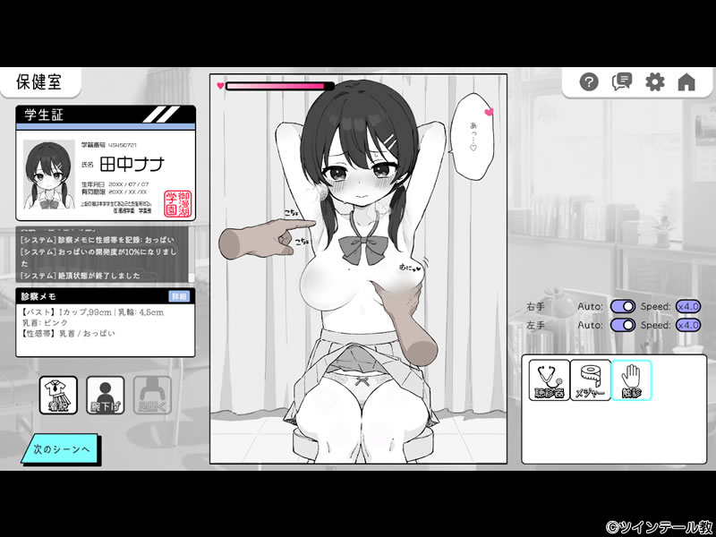 「健康診断」という名目で、清楚で真面目な美少女・田中ナナちゃんを隅々まで触診できる、羞恥系おさわりシミュレーションゲームです。流されやすいナナちゃんは、乳首やクリトリス、膣内などの敏感な部分を「検査」という理由で丁寧に触診されていくうちに、羞恥と快感の狭間で次第に反応が変化していきます。