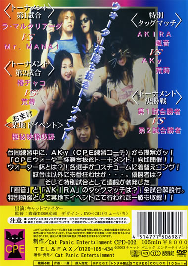 キャバレーの老舗「ハリウッド」にて行われたCPEショーキャットファイトを完全収録ッ!!CPEの選手に加え、飛び入りホステスも・・・追剥ぎの連続に場内騒然!!エロエロのガチンコショーキャットファイトをどうぞ!(同時収録)ウォーター杯勝ち抜きトーナメント