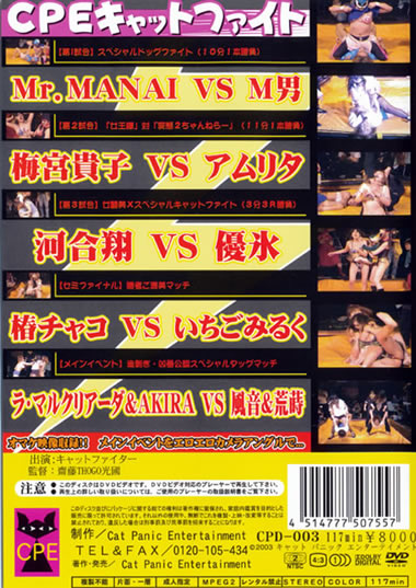 大人のおもちゃ・追剥ぎ・お笑い・Tバック…これがキャットファイトだ!2002年5月5日、新宿HEAD POWERにて行われたCPE初の満員札止め伝説イベント全5試合収録!
