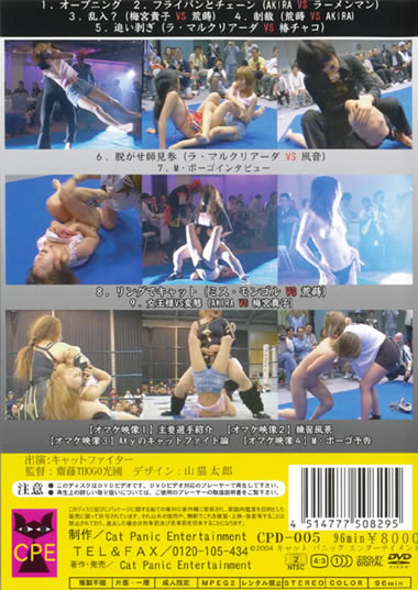プロレス界最凶のヒール『ミスター・ポーゴ』と、キャットファイト団体『CPE』が電撃合体!北関東を中心にお色気エロモードで地域密着キャットファイト!追い剥ぎ・SM何でもアリの女の闘いをどうぞッ!オマケ映像(主要選手紹介、練習風景etc)もたっぷり収録だぜ!