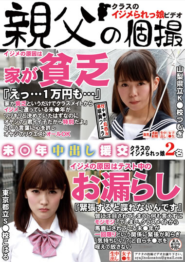 クラスのイジメられっ娘ほど、実はエロい!「家が貧乏」「テスト中にお漏らしした」という理由だけでいじめられている2人が、オヤジに騙されているとも知らず、心を許してしまい、オヤジのリクエストに全て答え一生懸命ご奉仕します。投稿者によると、アナルを舐めろや、セルフイラマチオもOKだったそうです。