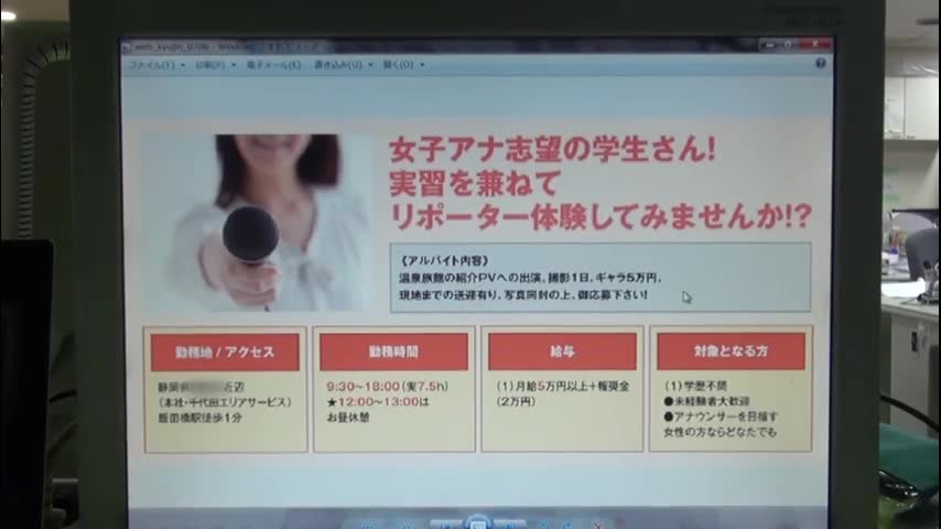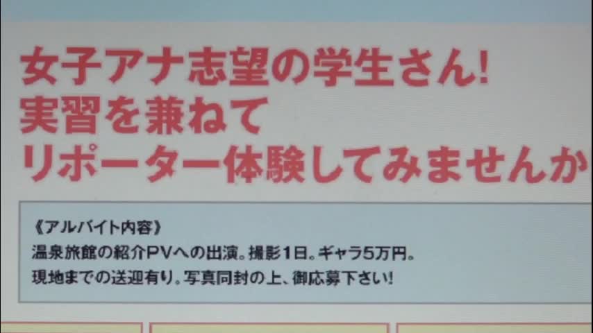 女子が憧れる職業、女子アナウンサー。そこで女子アナ志望の女子学生にレポーター実習を兼ねた温泉旅館のプロモーションビデオ出演をお願いしちゃいました!女の子たちは仕掛け人だらけの露天風呂でチ●ポまみれの赤面羞恥レポートを最後までやり遂げることが出来るのか!?厳選3名の未来の女子アナ候補をご覧下さい!