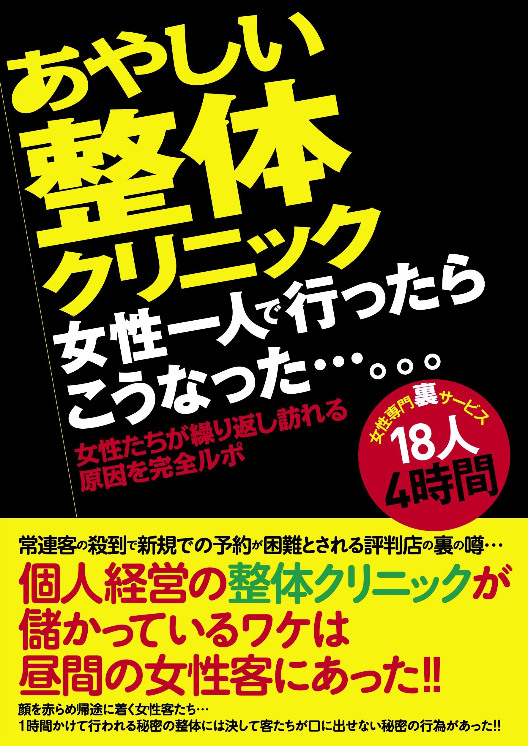 個人経営の整体クリニックが儲かってるワケは昼間の女性客にあった!!陰の噂が評判を呼び、女性たちの実体験から口コミで顧客急増!!男には決して教えられない快感天国に嵌ったら中毒化!!欲求不満解消完全保障!!セックスレスの女たちへの?営業