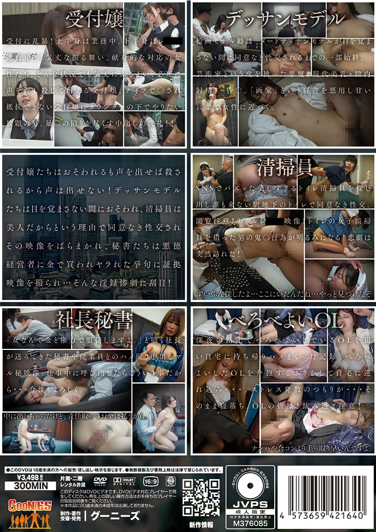 閲覧注意!職業別リアル性交映像が流出!今作品はそんな働く女性たちを受付嬢からモデル、清掃員、OLまで職場に潜む不条理な事件の一部始終を50名たっぷり5時間収録!受付嬢たちはおそわれるも声を出せば殺されるから声は出せない!デッサンモデルたちは眠ったすきにおそわれ、清掃員は美人だからという理由で●●されその映像をばらまかれ、秘書たちは悪徳経営者に金で買われヤラれた挙句に証拠映像を撮られ・・・そんな淫録惨劇に刮目!