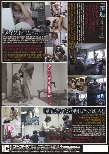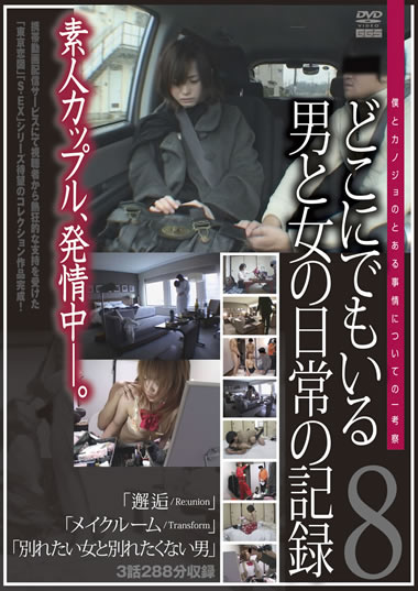 素人カップル発情中──! 携帯動画配信サービスにて視聴者から熱狂的な支持を受けた「東京恋図」「S.EX」シリーズ待望のコレクション作品。第八弾では「東京恋図」から同窓会で再会した男女のよくある過ち…「邂逅」と、企画AVの撮影現場の裏側を観察できる「メイクルーム」を、「S.EX」からはマンネリカップルの破局の瞬間を垣間見る「別れたい女と別れたくない男」の3作品を収録。定点カメラにより様々な男女の生活風景と性行為が映し出される…。