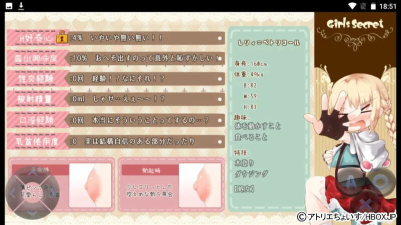 メニューの「オトメのヒミツ」から、レリィちゃんのエロステータスを確認できる!