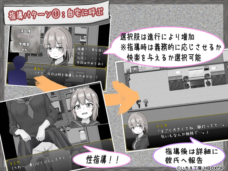 そういって、ふたりの性指導役になった主人公は、カノジョである紺野文香(こんの ふみか)ちゃんを自宅に呼び出す。