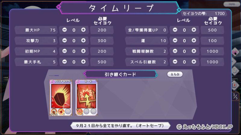 敗北後のタイムリープではセイヨクを倒してもらえる雫を使ってステータスを強化できる。