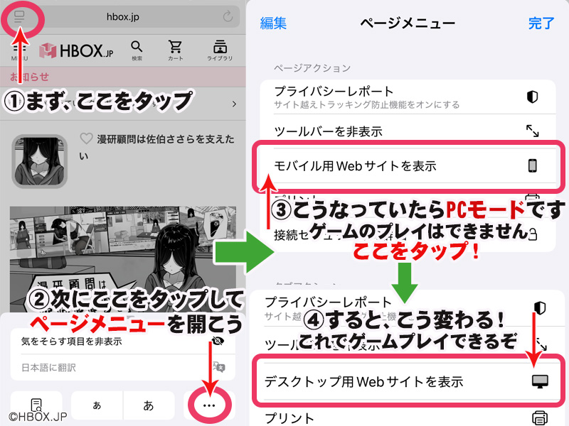 だからプレイできなかったのです。そんな時は 「モバイル用Webサイトを表示」 を一度タップ。すると「デスクトップ用Webサイトを表示」と変わります。