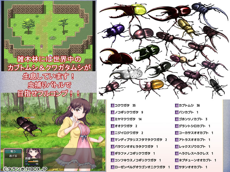 特にユニークなのが昆虫採集だ。山奥の雑木林に生息しているカブトムシやクワガタを捕まえられるのだが、その手段がなんとRPG風コマンドバトルである。