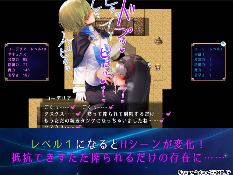 バトルファックで負けるとユーリは精液だけでなく、レベルもコーデリアにドレインされてしまう。冒頭ではユーリのレベル40、コーデリアは最弱のレベル1とかなり差があるのだが、おねショタ敗北Hをくり返すとどんどん実力差がなくなり、最後にはレベル1まで下げられてしまう。