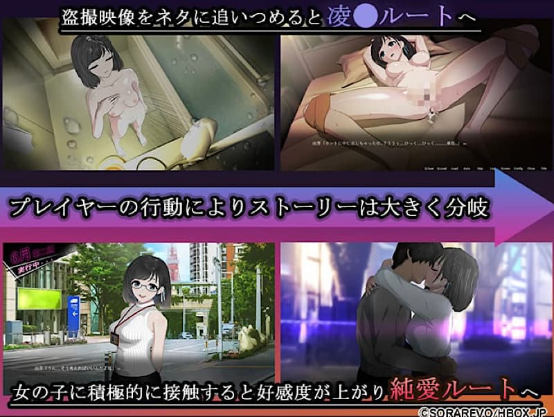 盗●したネタを使ってヒロインを脅し凌●ルートへ突入することも可能だが、好感度が上がれば純愛ルートも用意されているぞ。