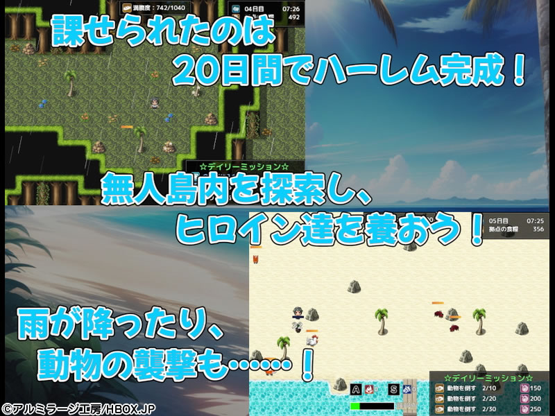 無人島内で採掘や伐採、釣りなどをしたり、時には動物の襲撃から拠点を守って、ヒロイン達を養おう!