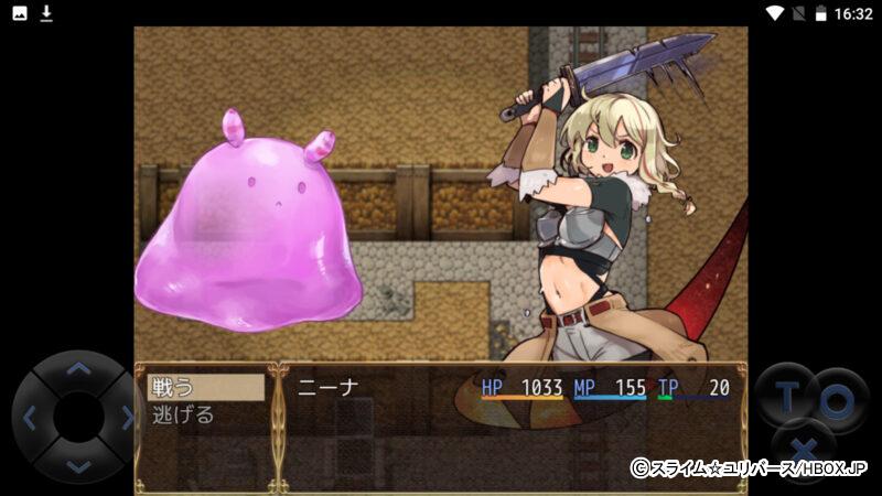 少女を助けようとスライムと戦うニーナちゃんだが、スライム相手に物理攻撃は聞きづらく苦戦する。