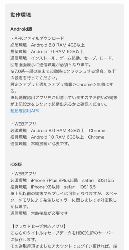 「クラウドセーブ対応」のタグが付いたアプリは、配信元であるHBOXのサーバに保存されます。