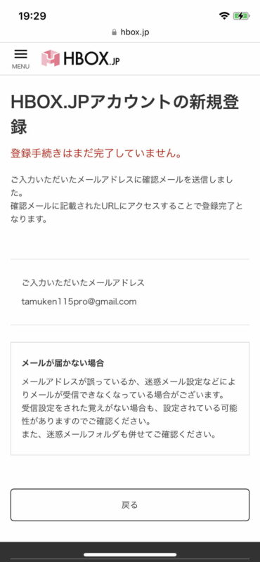 入力したメールアドレス宛に、登録確認のメールが送信されます。
