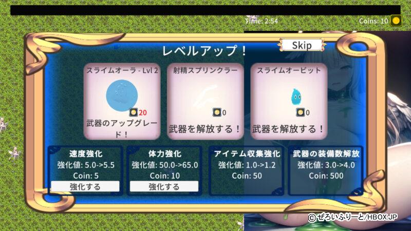 画面上部にある経験値バーがマックスになるとレベルアップし、強化画面が表示される。
