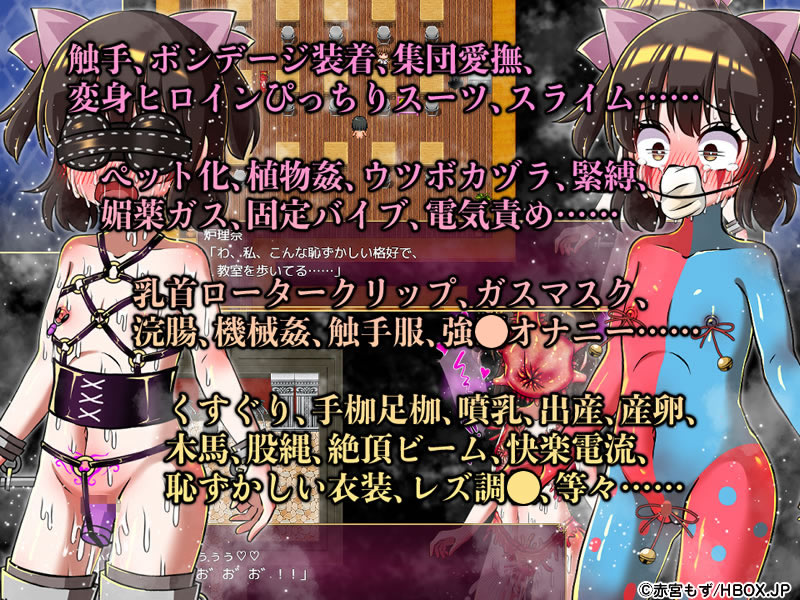 触手・ボンデージ装着・集団愛撫・変身ヒロインぴっちりスーツ・スライム・乳首ロータークリップ・植物姦・媚薬ガス・固定バイブ・電気責め。