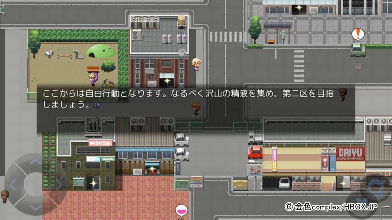 まずはビックリマークやハートマークのイベントを探しながら、街中の男たちと戦闘で精液を絞り取れ!