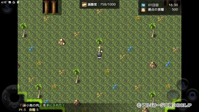 フィールド上には光る場所からアイテムを採取でき、動物を倒せば食料が手に入った。