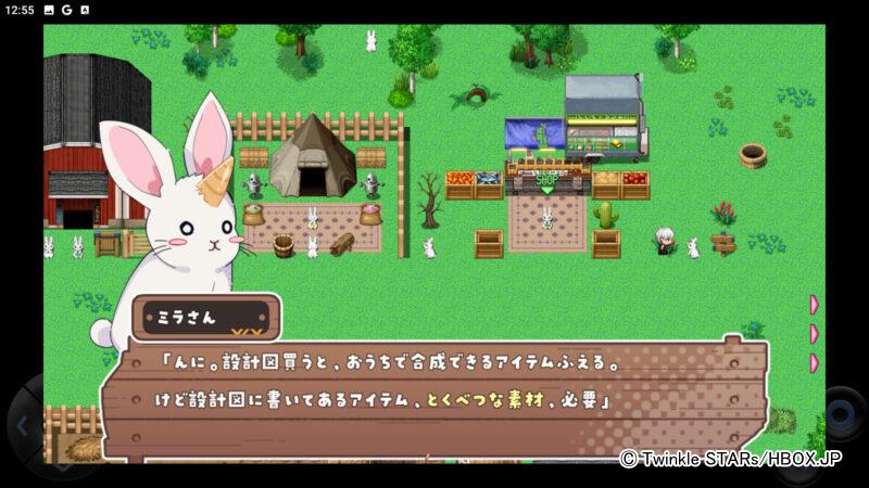 ここではお店を出すミラさんと交易ができて、畑用の種や牧場用の家畜、新しい工作に必要な設計図なども手に入る。