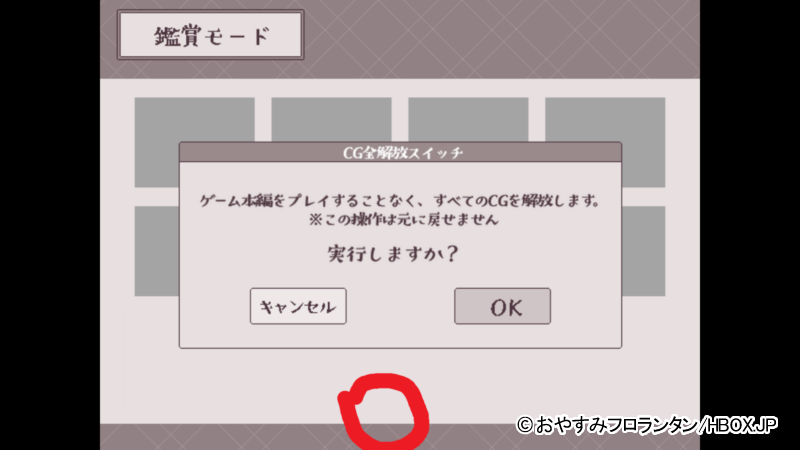 画像で赤く囲った部分にCG全開放スイッチが隠されているので、もし必要なユーザーはそこらへんをいっぱいタップして探してほしい。