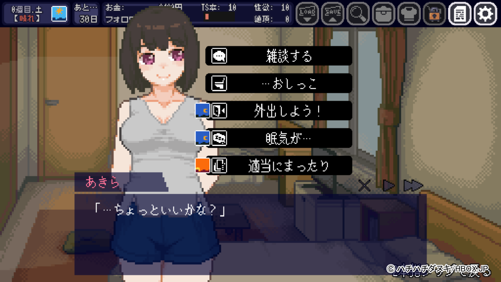 基本的には部屋にいるアキラちゃんに話しかけて、まったりしたり雑談したり外出したりと主人公が自由に行動できる。