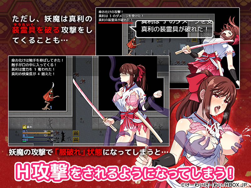 戦闘システムはシンプルだが、演出面はむしろ気合が入っている。ダメージによって衣服がはだける脱衣差分、妖魔がヒロインをなぶるH攻撃など、バトル中だからこそのお色気展開が盛りだくさんだ。特にH攻撃は妖魔の数だけレパートリーがあり、プレイヤーを飽きさせない。